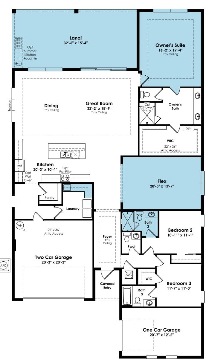 Privately positioned at the rear, the spacious Owner’s Suite offers a relaxing retreat with direct lanai access, a spa-inspired bath, and a generous walk-in closet. Secondary bedrooms are thoughtfully arranged for guest comfort, while the versatile Flex Room provides the perfect space for a home office, media room, or hobby area.